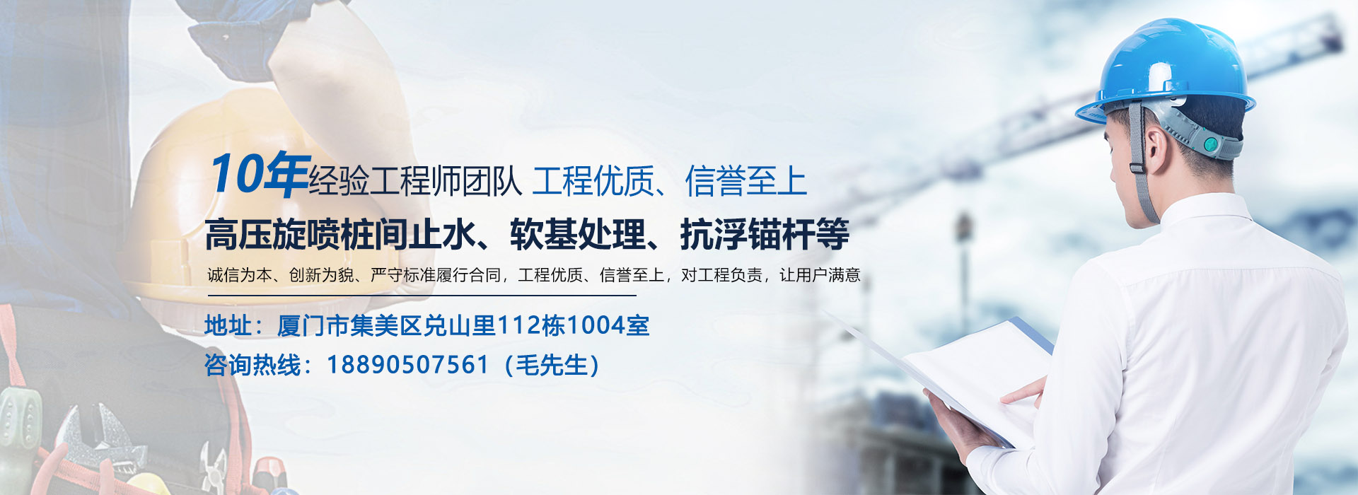 公司主營:高壓旋噴樁間止水、軟基處理、抗浮錨桿、回收錨索、地質勘察、地基加固、降水井、攪拌樁、壓密注漿、引孔注漿、雙液注漿等,公司規模龐大,不斷超越、追求完美,誠信為本、創新為貌、嚴守標準履行合同,工程優質、信譽至上,對工程負責,讓用戶滿意。